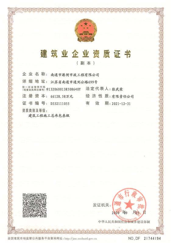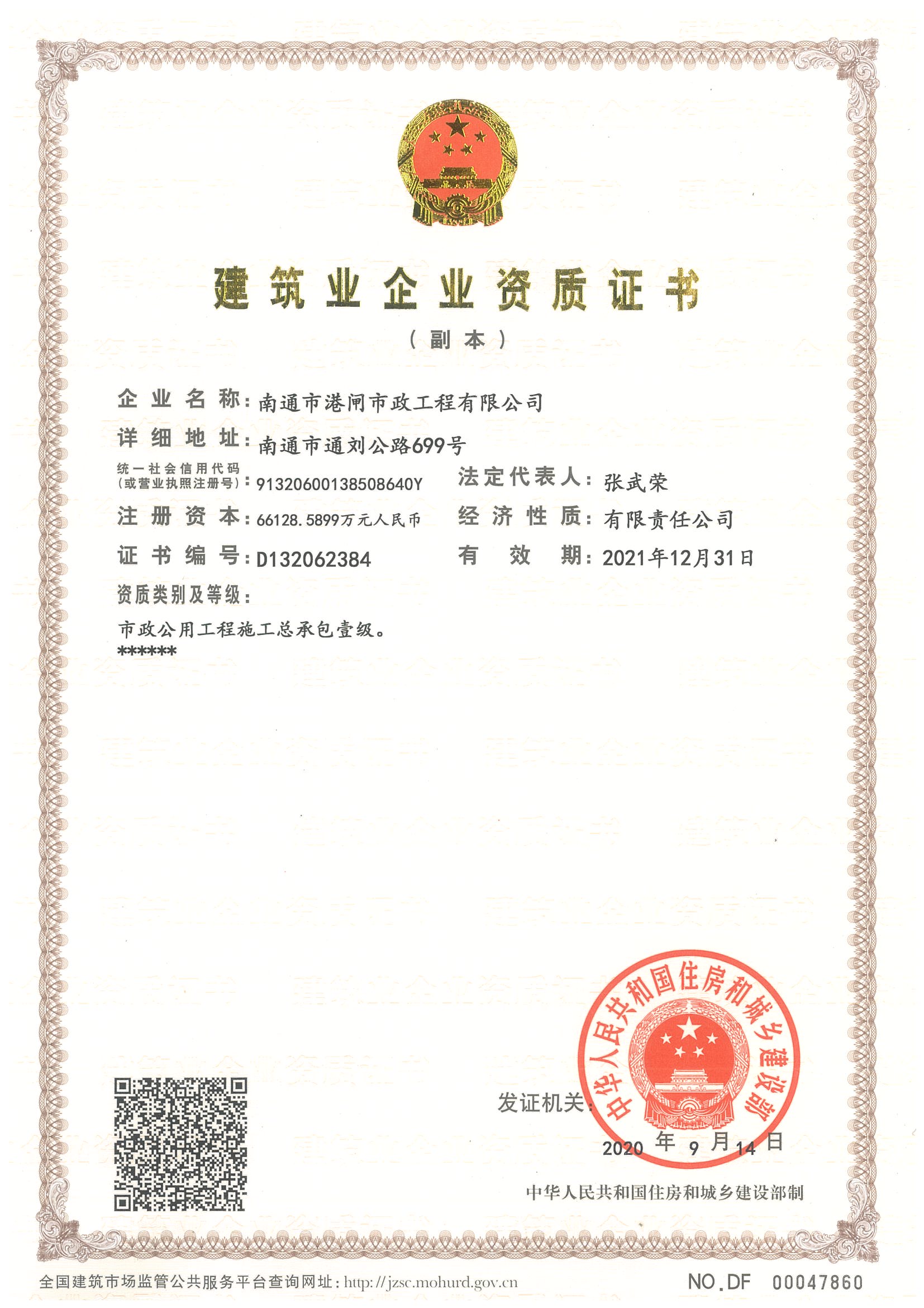 建筑業(yè)企業(yè)資質(zhì)證書(shū)(市政公用工程施工總承包壹級(jí))