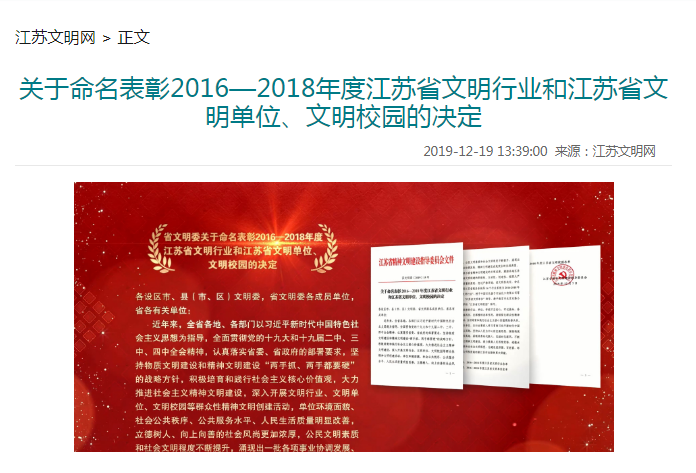 日前,江蘇省精神文明建設委員會印發(fā)《關于命名表彰2016—2018年度江蘇省文明行業(yè)和江蘇省文明單位、文明校園的決定》,我公司再次榮獲“江蘇省文明單位”榮譽稱號。